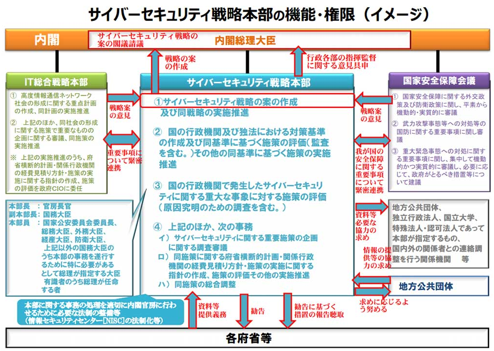 http://itpro.nikkeibp.co.jp/atcl/watcher/14/334361/082200035/同法では国に対し「サイバーセキュリティに関する総合的な施策を策定し、および実施する責務を有する」と規定。国がサイバー攻撃の監視と分析を行い、関係省庁には攻撃について情報提供を義務付ける。また、官房長官をトップとしたサイバーセキュリティ戦略本部を設置し、セキュリティ戦略を策定する。