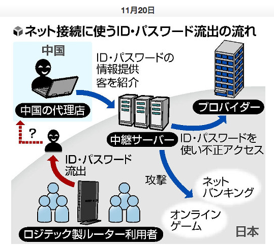 中国の利用者向けの「中継サーバー」がインターネットの不正接続に悪用された事件で、警視庁に摘発されたサーバー運営会社2社が使用した他人名義のIDやパスワードの大半が、パソコン周辺機器メーカー大手の無線ルーターから流出したものだったことが、同庁幹部への取材でわかった。