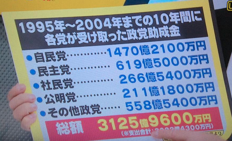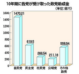 (1995年 新進党・公明系)4億744万円(96年 社民)会議費名目で151回計3013万円(97年 旧新進)「公課(租税など)及び保険料」名目で都税事務所に1600万円(1999、2000年、01年 自民)自民=赤坂プリンスホテル会場費1888万円、民主=設営・運営費1811万円、公明=運営費679万円、自由=会場一式1906万円(02年)幹事長への組織活動費(02年 自由)事前・本番アナウンサー代180万円(04年 自民埼玉県連)、ウグイス嬢人件費28万円(同 民主茨城県連)自民=1800万円(04年本部)、民主=1200万円(03年本部)、社民=300万円(04年富山県連)日本共産党は国民の納めた税金が支持しない政党にも強制的に回される制度が思想信条の自由を侵すとして廃止を求め、受け取りを拒否し続けています。