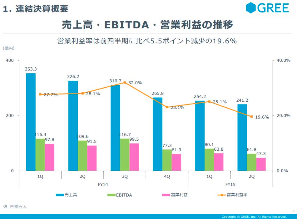 グリーは2月4日、2015年6月期通期の連結業績予想を公表した。営業利益は前期から42.9%減の200億円、最終損益はゼロ(前期は173億円の黒字)と大幅な減益になる見通しだ。「国内外のネイティブゲームの新たなヒットタイトル創出に時間を要することが主因」としている。