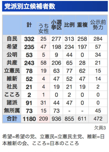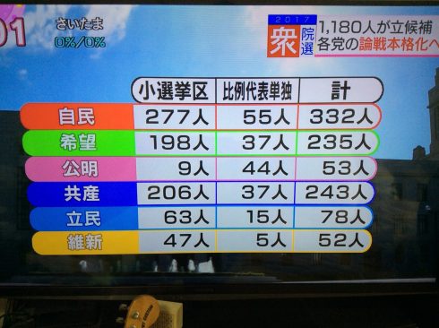 自民党 332人 希望の党235人 公明党53人 共産党243人 立憲民主党78人 維新の党52人