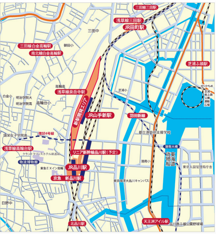 ❏新駅が出来るのは山手線の南西部分、「田町」駅と「品川」駅の中間