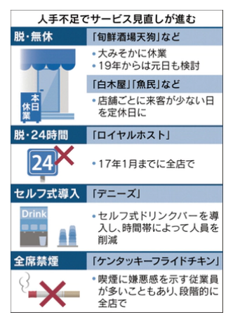 ❏(2017年)1月までにファミレス「ロイヤルホスト」の全店で24時間営業をやめたロイヤルホールディングスも来年から休業日を導入する。