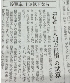 「投票率1%低下なら『若者1人13万円損』の試算」(日経新聞47面 2014年11月26日)