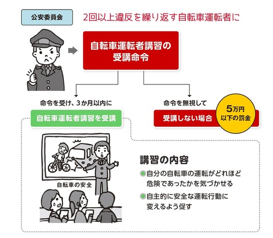 3年間のうち2回目の摘発をされた場合に、警察が実施する「安全講習」を受講しなくてはならなくなります(ここで手数料の5700円が徴収されます。これが反則金と同じ位置付けになります)。費用はもちろん、講習は1回3時間で最後にテストまであるというのですから、負担はかなり大きくなります。この安全講習を受講しないと、事件扱いとなり、裁判所への呼び出しの上5万円以下の罰金が科されます。
