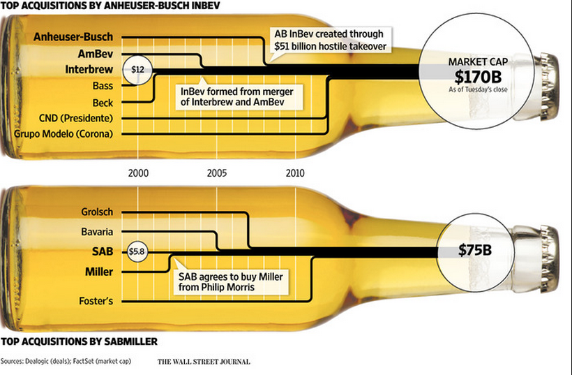 ABインベブによる、680億ポンド(1040億ドル)SABミラー買収案が、暗礁にのりあげているという。
