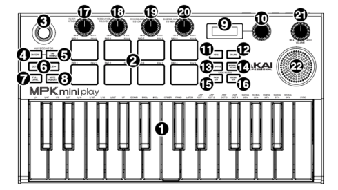 1. キーボード:ベロシティ対応の 25 鍵盤です。OCTAVE UP/DOWN ボタンを押す事で、上下いずれも最大 4 オクターブまで変更可能です。また、鍵盤は特定のコマンドの入力にも使用します。アルペジエーターのパラメータを設定するには、本機左上 ARPEGGIATOR セクションの ON/OFF ボタンを押しながら、任意の鍵盤を押します。KEYS ボタンを押し、エンコーダーノブを回してお好きなキーボードプログラムをすると、鍵盤で演奏することができます。