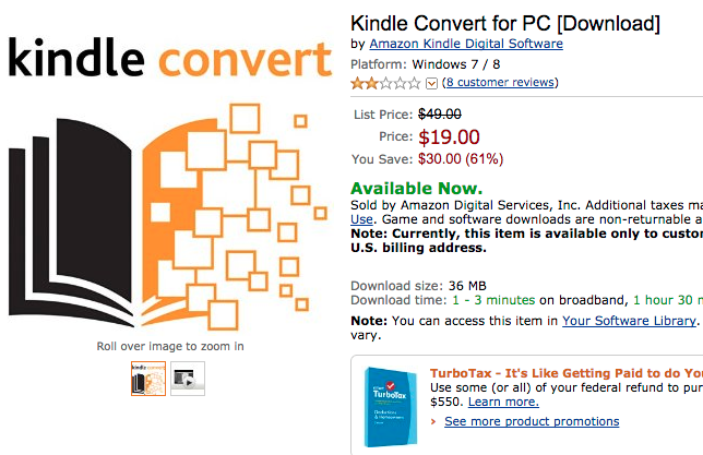Kindle Convert for PCは、現在米国からのみダウンロード購入が可能。販売価格は49.00ドルだが、現時点で19.00ドルの特別価格になっている。