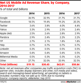 Google commands 32.9% of mobile ad revenue in the US, or nearly $10.02 billion. Facebook captures 19.4%, or nearly $5.9 billion. By contrast, Millennial Media captures 0.3%, or $101.2 million.SHARE51865353Regardless of the ambitious nature of its goal, the acquisition will help the combined company compete more effectively for mobile display ad dollars.