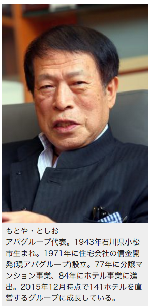 「東京のアパホテルは連日満室です。昼間だけ部屋を使う人もいて、1つの部屋が1日に2回売れることも珍しくない。結果として月間稼働率100%超えを達成しています。今後、東京はまだまだ伸びるでしょうね。国内・国外を問わず観光客もどんどん増える。2000万人来たっておかしくありません。オリンピックだって私は東京での開催を確信していました。だからどんどん出店する。地下鉄駅1つごとに1店舗つくってもいい。それを可能とする資金も十分にある」