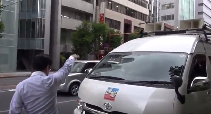 マイクとスピーカーで街宣する「連帯」のマークのある車両。