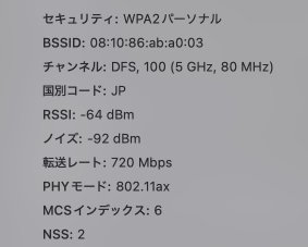 MCS値が低いのは、電波強度(RSSI -64 dBm)が影響しています。