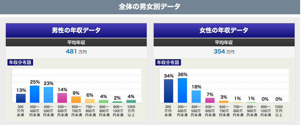 男女別の年収分布の方が、日本のサラリーマンの収入の実態に近いように見える。