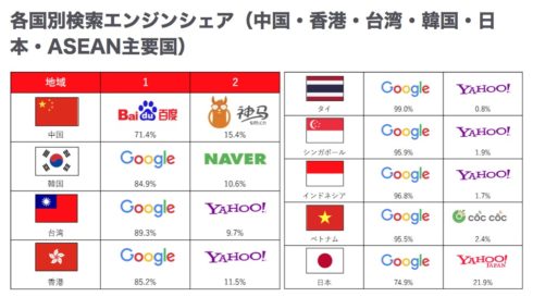 中国ほか2019年海外検索エンジンシェア最新情報!香港・台湾・韓国・日本・ASEAN主要国2019年1月ランキング:Google Yahoo Baidu他(Webサイト運用担当者向け)