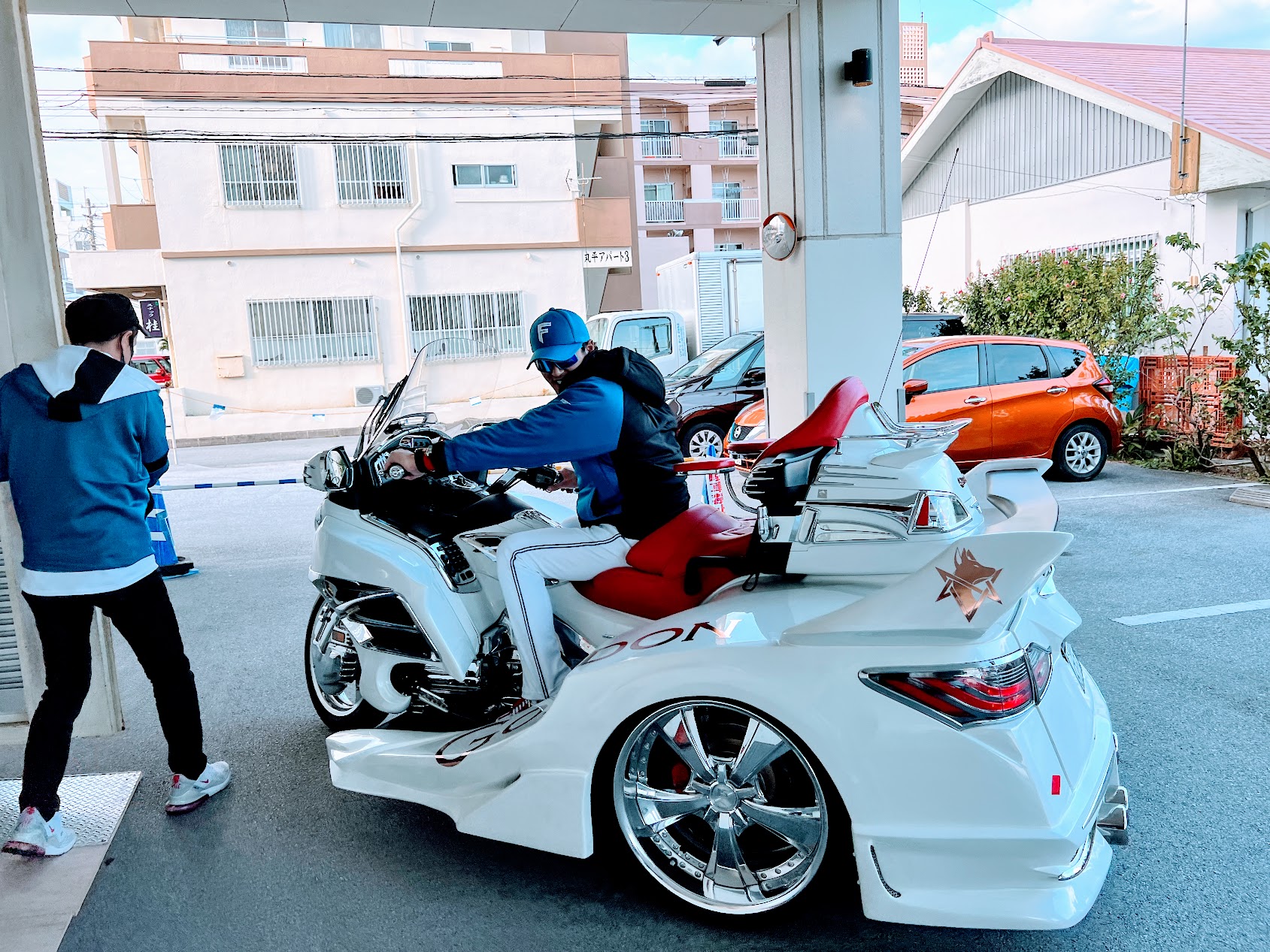 たくさんの人がスタジアムで、待ってるので戻ってきたのかなと思いながら、17時になったからお店に向かったところ突然ド派手な三輪がやってきました。