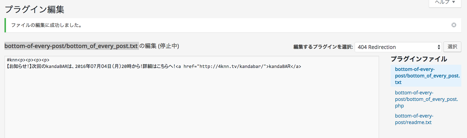 プラグイン>インストール済みプラグイン>Bottom of every post>編集>bottom-of-every-post/bottom_of_every_post.txt