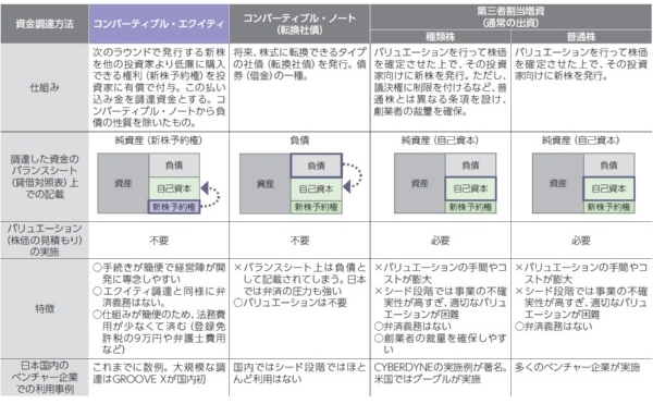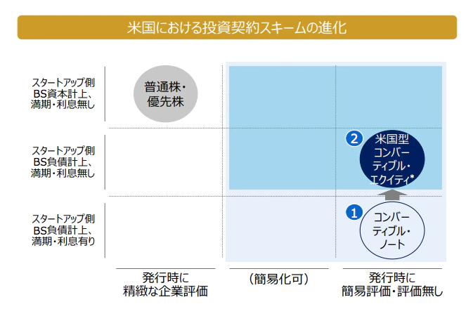 ■「コンバーティブル・エクイティ」は、コンバーティブル・ノートから支払いの満期、利息の概念を取り払ったものと考えることができます。払い込んだ金額をもとに一定の株式に転換する権利を取得するのはコンバーティブル・ノートと同様ですが、支払いの満期や利息が発生しないため、スタートアップ側は返済を強制されることがありません。また、バランスシートに負債として計上されないというメリットもあります(ただし、米国のコンバーティブル・エクイティについても、バランスシート上、資本として計上できるという見解が必ずしも確立しているわけではなく、負債として取り扱われるという見解もあります)。