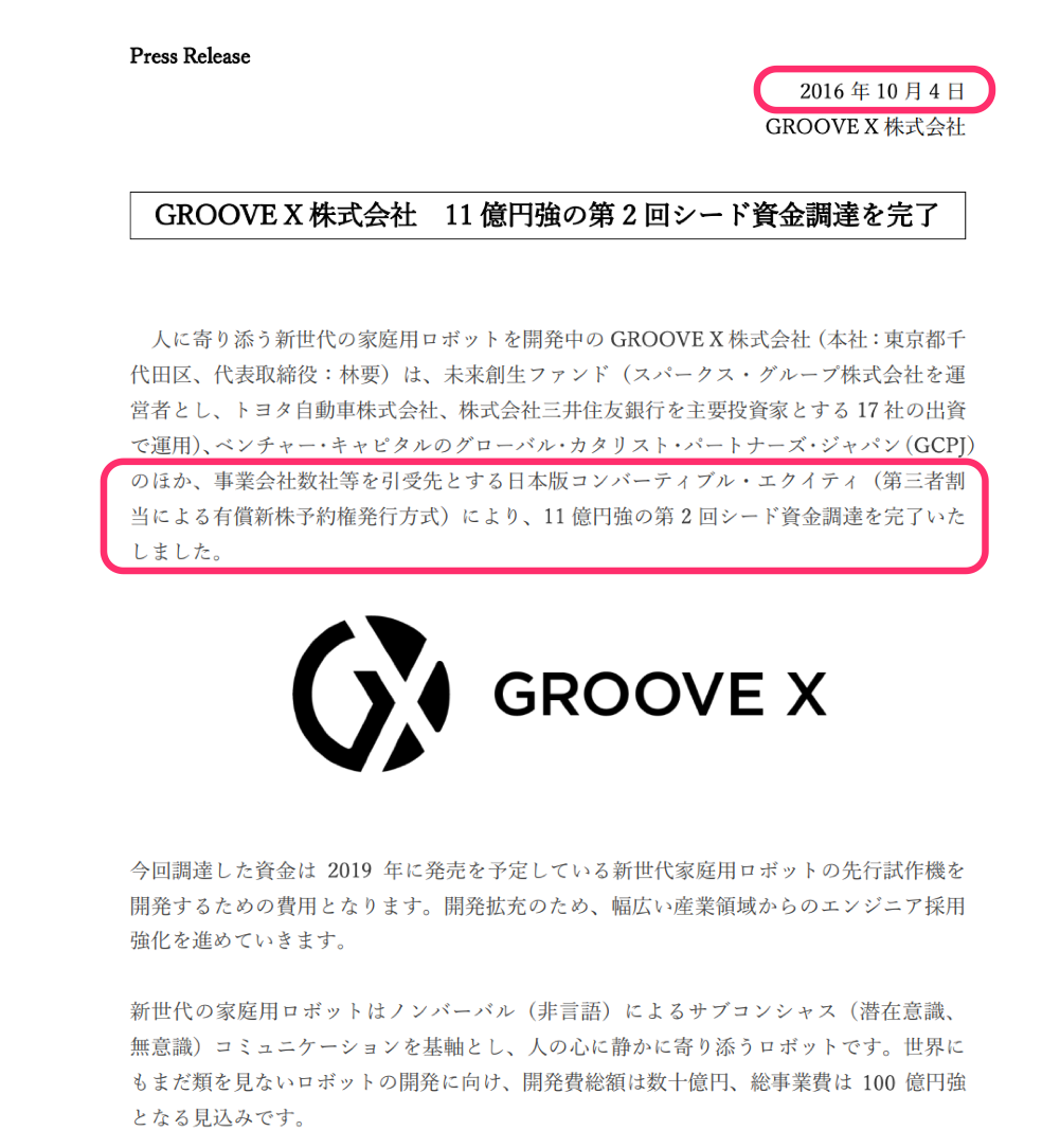 2016年10月4日、LOVOTを製造販売することとなるGROOVE X株式会社が、日本版『コンバーティブルエクイティ』によって、11億円強の第2回シードラウンドの資金を調達した。