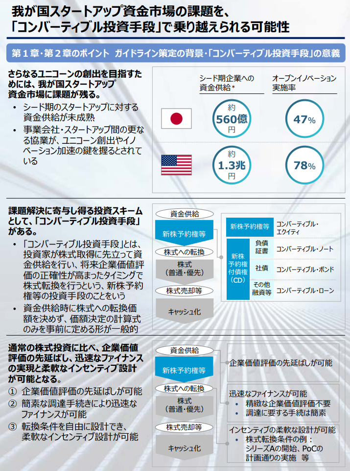 ■ベンチャー・スタートアップ実務を巡る課題の中に「シードの調達方法を改善する必要がある」というテーマがあって、それに応える方法として、これまでコンバーティブル・ノート(転換社債)という実務がありました。もともとはアメリカで開発された調達手法で、アメリカでは2007、8年頃から、バリュエーションをせずに、初めにお金を貸し付ける方法がありました。ノート(手形)で貸し付けて、エクイティラウンドが来たら、それを株に切り替える。ブリッジファイナンス(新しいファイナンスを行うまでの橋渡しとしての短期融資)と同じ仕組みをとって、シードでお金を出す方法です。日本では、新株予約権付社債を用いて同様のことができます。ただ、普通にノート貸し付けですると負債が立つので、特にエクイティが少ししかない場合、資金調達によって負債が多く計上され、最初から債務超過の会社になってしまいます。