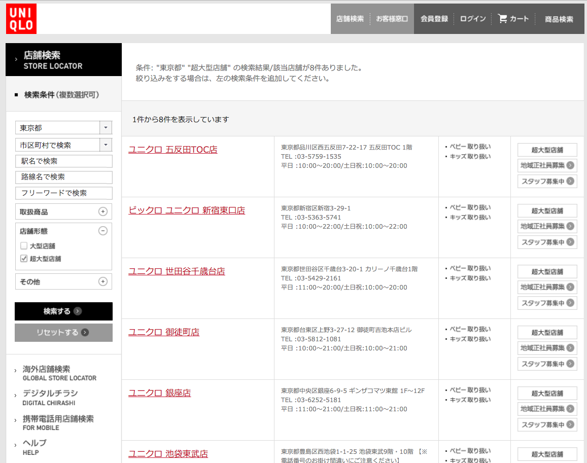 ユニクロは唯一、大型店舗と超大型店舗で検索することが可能。