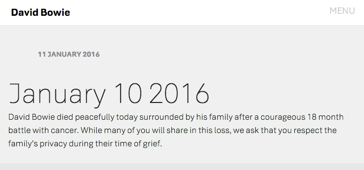 David Bowie died peacefully today surrounded by his family after a courageous 18 month battle with cancer. While many of you will share in this loss, we ask that you respect the family’s privacy during their time of grief.