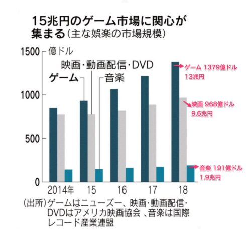 18年の家庭用やスマホ、パソコン向けを合わせたゲーム産業の規模は1379億ドル(約15兆円)。