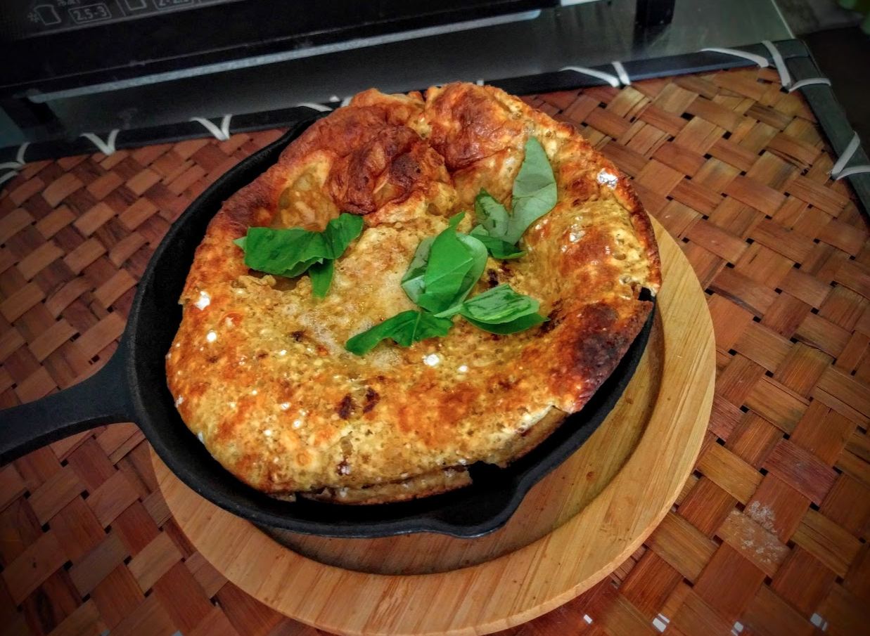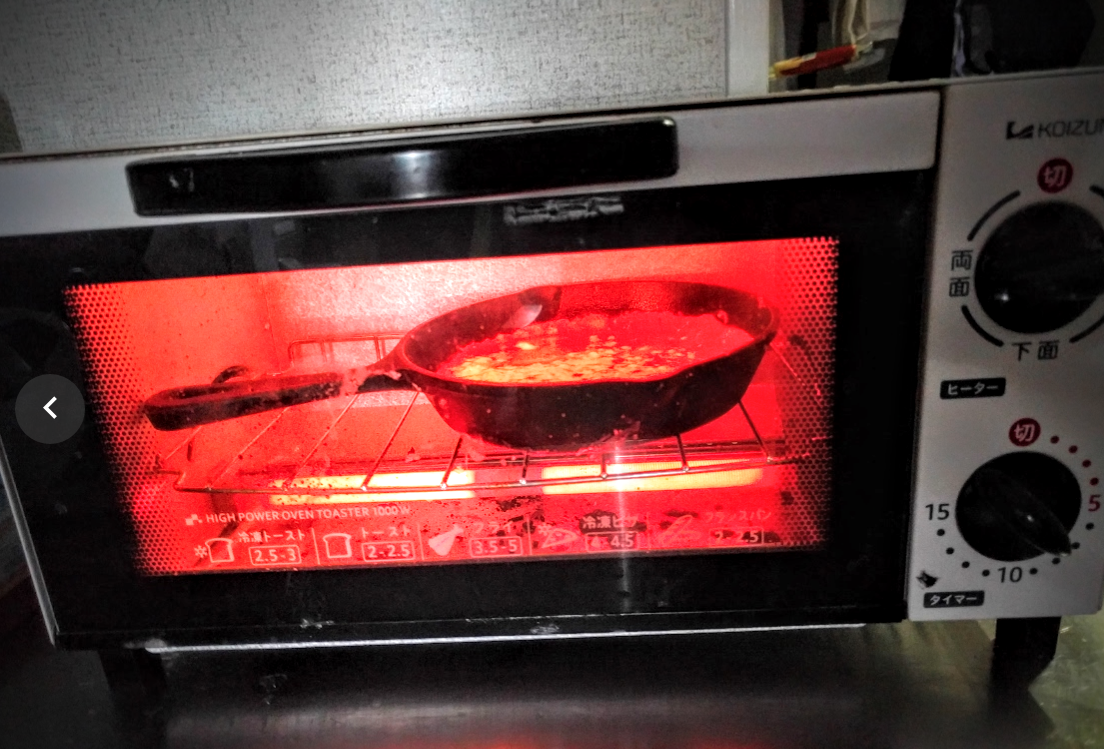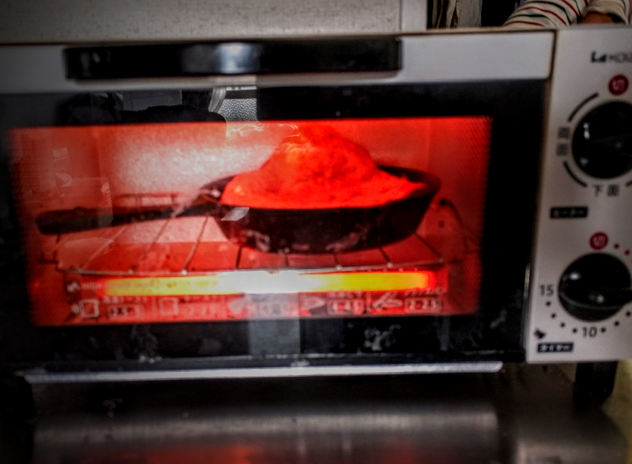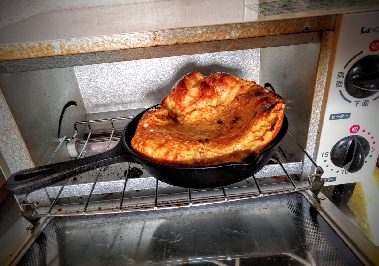 よく混ぜ終わったら、熱くなったスキレットにバターを落とし、スキレット全体にのびたら、ダッチベイビー液を投入。そして、オーブンではなく、オーブントースターへ。ウチのオーブン電子レンジだと、オーブン皿を毎回ひっぱりだしてくるのが面倒なので、オーブントースターです!