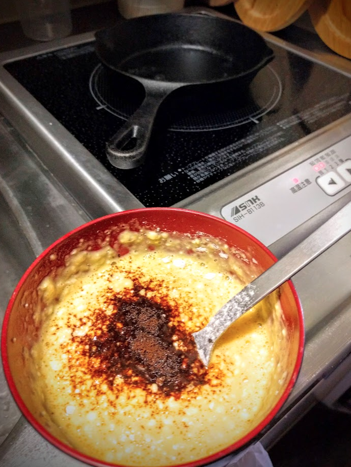 タマゴひとつ、牛乳50ml 、小麦粉30g、インスタントコーヒー、(エスプレッソの代用)小1、バター10g