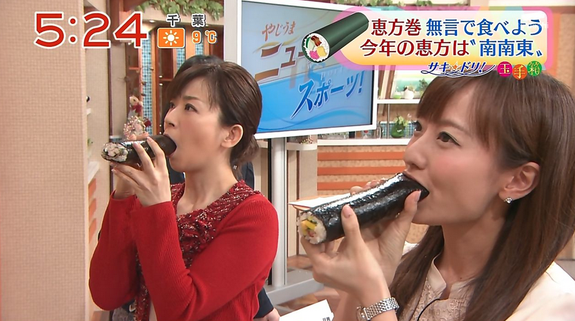 また、明るい話題不足のテレビにとっても「恵方巻き」の無言の咥える表情は、格好のネタ対象となったようだ。