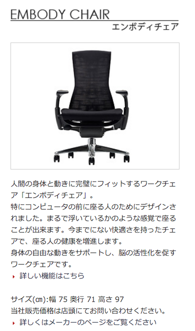 ただいま、オークションで毎度おなじみの落札を狙っていたが、ふと、大塚家具のEmbodyを買ったと記述されていて、「大塚家具 エンボディチェア」で検索してみた