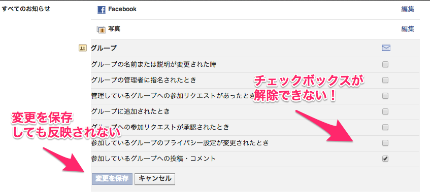 【2】facebookや写真やグループなどの右の【編集】をクリックして、チェックボックスをはずしていくと、お知らせ音のポポロンという音がとまる。