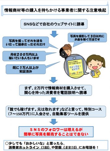 ❏「写真を投稿するだけで稼げる」とうたい高額なマニュアルなどを売る手法に問題があるとして、消費者庁は(2017年10月)30日、消費者安全法に基づき事業者名「アイデア」(東京都)を公表し、注意を呼び掛けた。