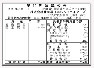 日本ハムファイターズの球団経営。95億円の資産のほとんどが『固定資産』で92億円、親会社の純利益は480億円