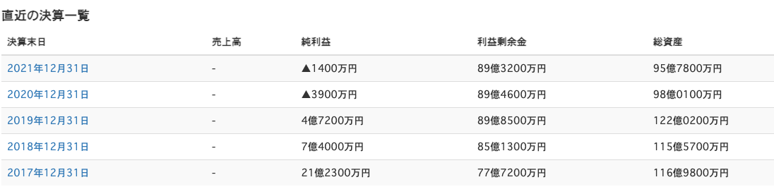2019年末の決算をピークに2020年 2021年と純利益も総資産は減少。利益剰余金は89億円を持続中。