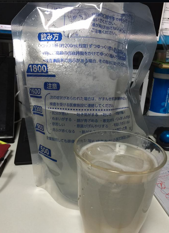 ポカリスエットもどきの1.8リットル 汗もかいていないのに前日に900ミリ。検査、当日の朝に900ミリ飲む。