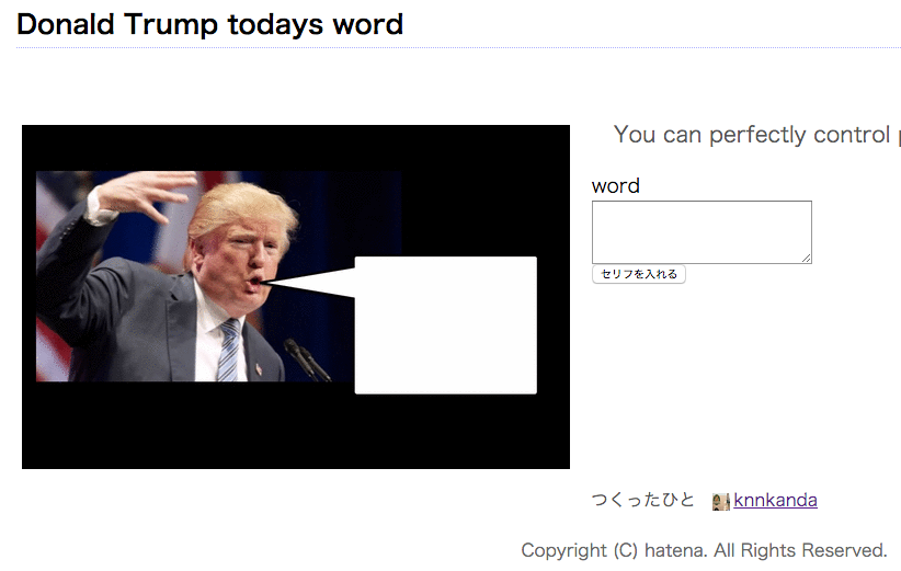 ホームコラム ドナルド・トランプ・ジェネレーター作ったよ! DonaldTrump 2016年03月09日 水曜日2016年03月10日 木曜日 SHARE ポスト シェア はてブ LINE ドナルド・トランプの暴言を作って拡散しよう! 本当にこの人がアメリカの大統領になるという可能性がでてきたので、まじ驚く! http://bit.ly/1RzfFhn http://serif.hatelabo.jp/5ffd42c1530e74d39f16b5bd61c2f0ec91974682/ You can perfectly control presidential candidate voice. Views: 0
