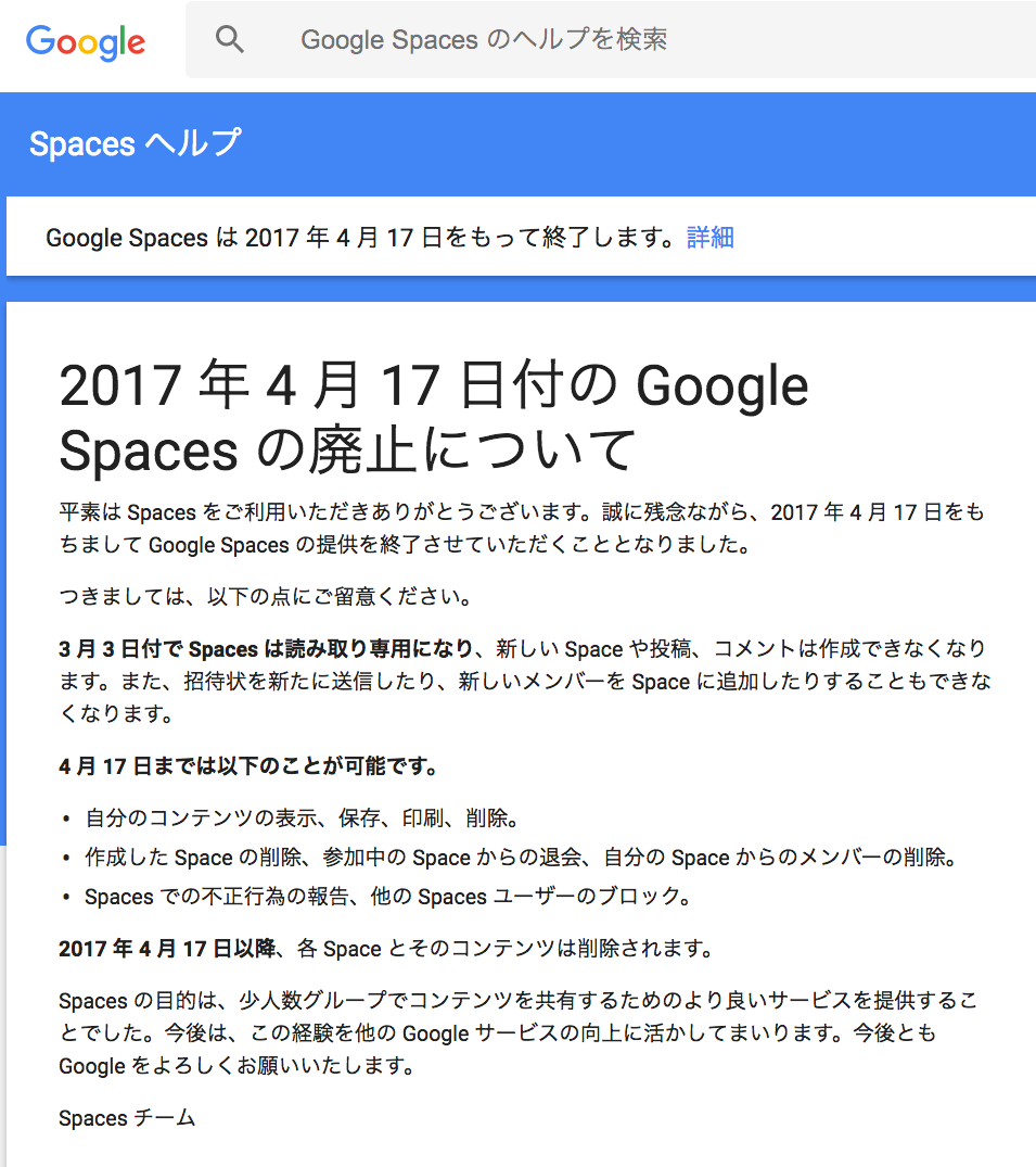 Spaces の目的は、少人数グループでコンテンツを共有するためのより良いサービスを提供することでした。今後は、この経験を他の Google サービスの向上に活かしてまいります。今後とも Google をよろしくお願いいたします。