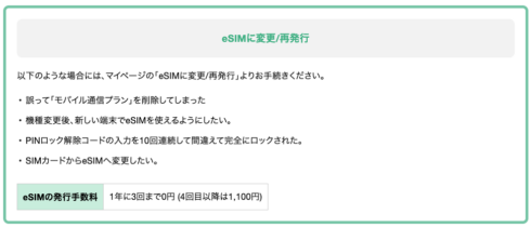 eSIM再発行は「1年に3回まで0円(4回目以降1,100円)」なので、機種変更程度なら料金は基本かかりません。