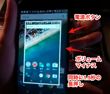 Google Nexus5x の場合は、ホームボタンと音量ボリュームのマイナスを1.5秒間だけ長押しするとキャプチャされるという。