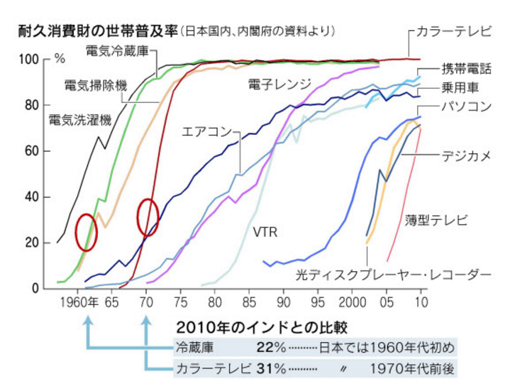 このグラフは日本の家電品の普及率と年代をマッピングしたものだ。
