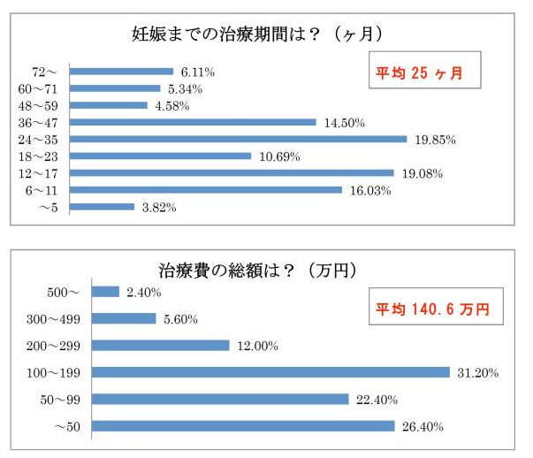 なお、今回の調査は、妊娠した人を対象に実施。なかなか妊娠できず、不妊治療を続けている人は多く、それらを含めると調査結果以上の治療費、治療期間を有していると予想される。