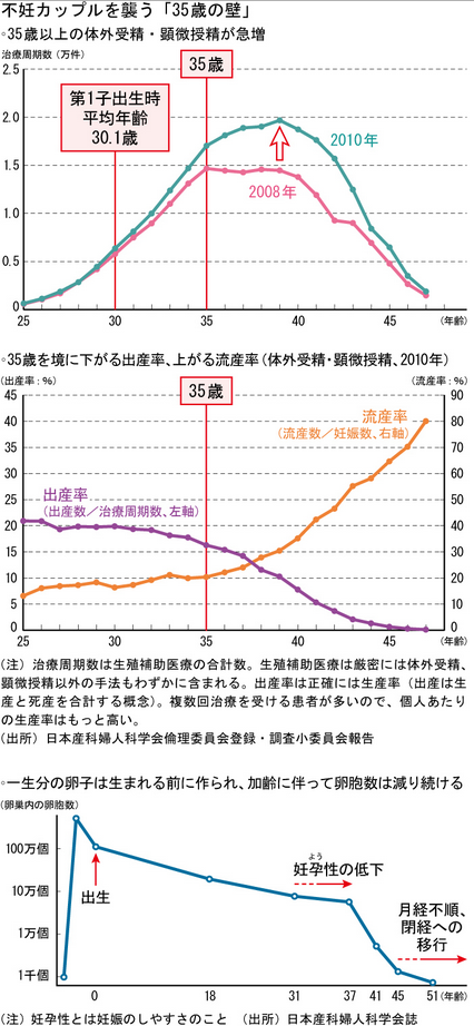 35歳以上の年齢層なのだが、皮肉なことにその35歳近辺を境に出産率は下がる。原因は「卵子の老化」にある。大学を卒業してから「卵子の老化」の35歳までというとわずか約10年しかない。「仕事に慣れ、子どもが欲しいなと思ったら35歳を過ぎていた」そう話す女性は多い。