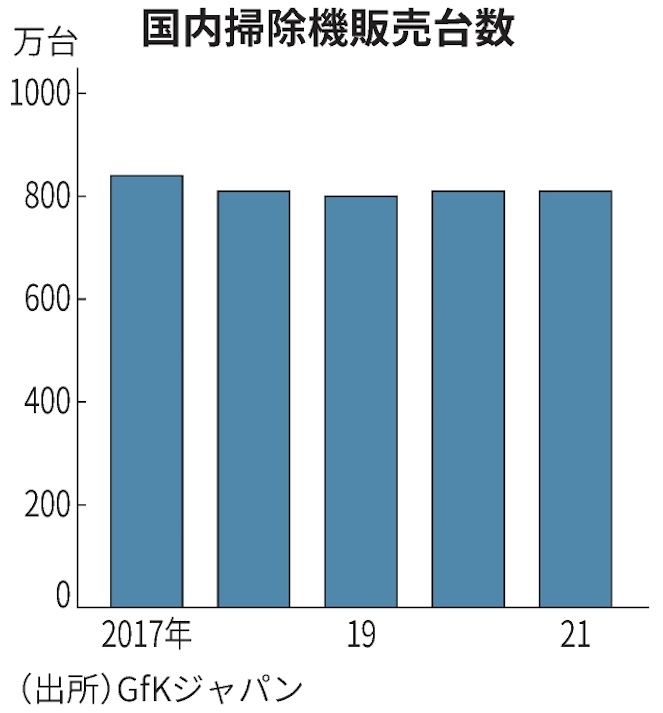□ルンバがけん引してきた日本のロボット掃除機市場は伸び悩んでいる。GfKジャパン(東京・中野)によると、21年の国内ロボット掃除機販売台数は20年比4%減の50万台弱で7年ぶりに減少した。掃除機全体の販売台数も800万台前後で頭打ちだ。アイロボットは21年、高単価な機種の販売を伸ばして日本で増収を達成したが、継続的な成長には事業の多角化が不可欠だ。