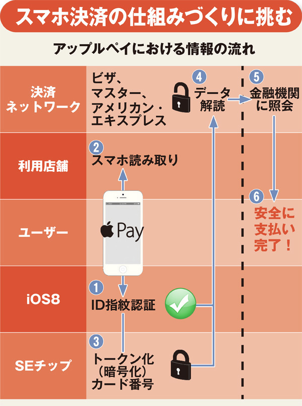 ◯国内のクレジットカード決済の約70%を支えている金融システムの「キャフィス(CAFIS)」。運営をしているNTTデータは一切公表していないが、すでにビザやマスターといった決済大手の幹部たちと、暗号化したデータの照会方法やシステム設計についての交渉を始めているもようだ。普及のボトルネックになるのが通信規格だ。アップルは、新型iPhoneでの決済に「NFC(近距離無線通信)」と呼ばれる技術を採用。搭載するNFCチップは、オランダの半導体大手NXPセミコンダクターズが供給しており、通信規格は国際標準の「TypeA/B」とされている。