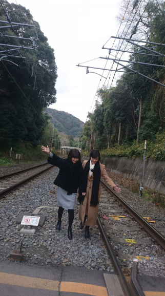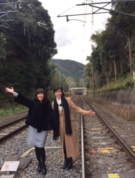 何気ないロケ先でのオフショット…。しかし、場所が線路と見えるような場所での撮影だった。