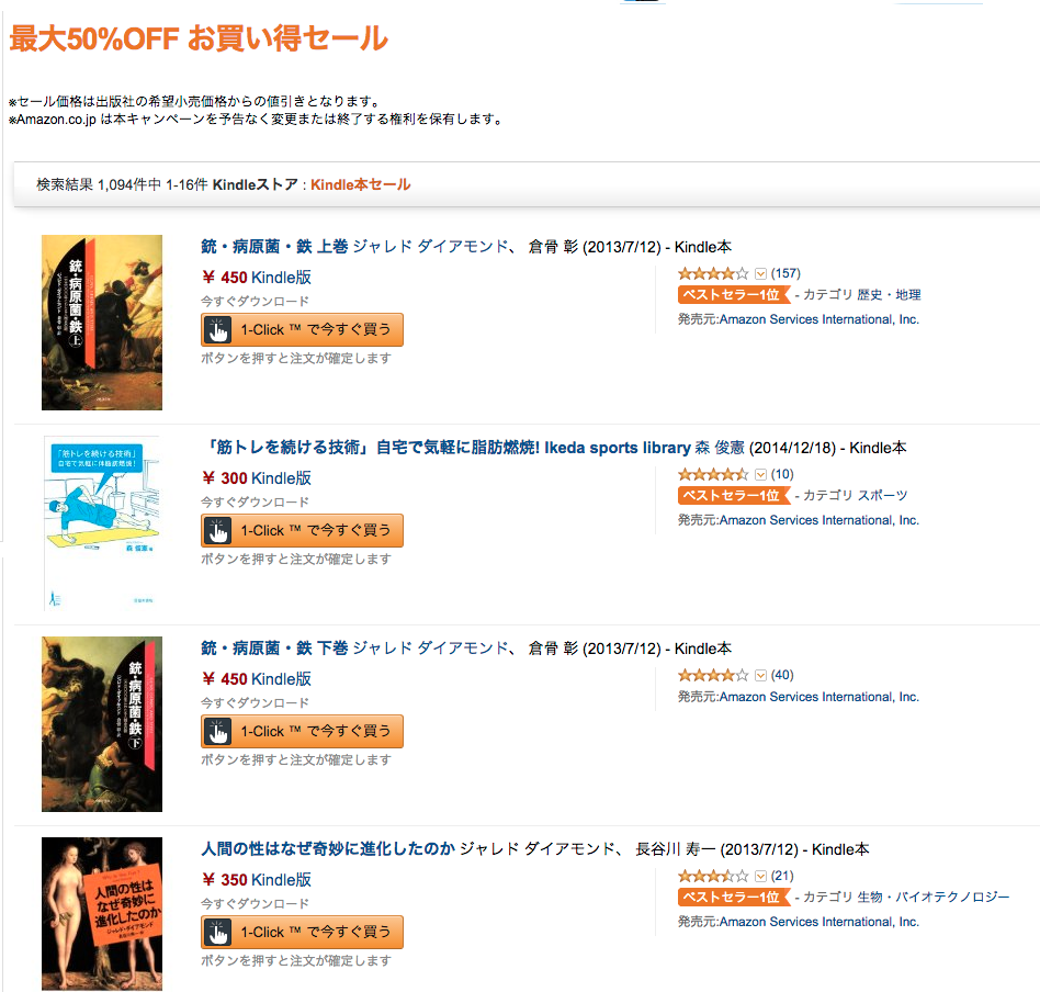 読んでみたかった本が一気に 50%オフ 電子書籍はブックオフに販売することもできないから、これくらいの50%オフくらいではじめて購買意欲が刺激される。iPad mimiやiPhone 6Sでは十分に読書を電波の届かない時にできるようになった。