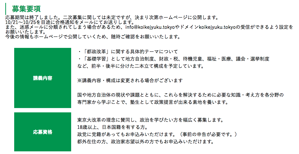 本塾は、人材育成に主眼を置いた組織であり、特定選挙において「都民ファーストの会」「小池百合子」の公認・推薦・支持・支援を塾生に約する組織ではない。また、本塾は特定選挙において公認・推薦・支持・支援を行わない。
