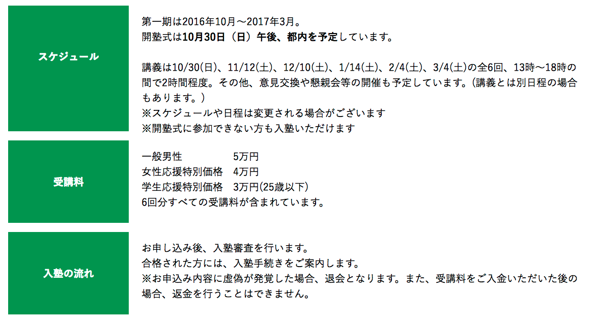 本塾の各期における受講料は、性別、年齢、社会的属性等に応じて、事務局が別に定める。