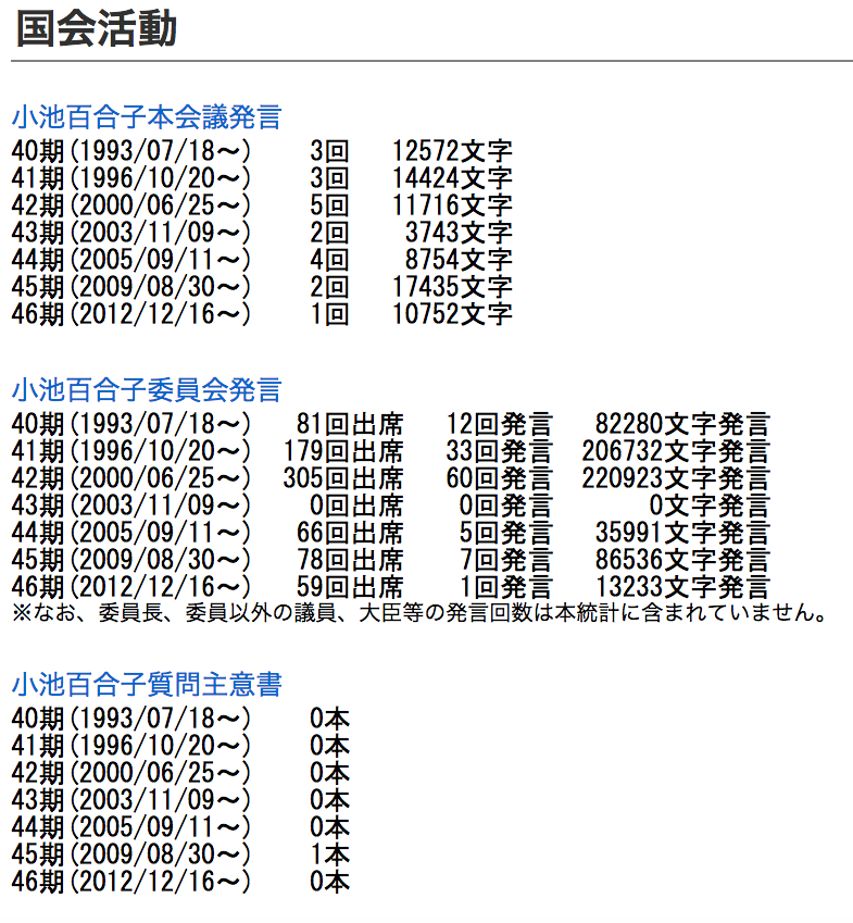 小池百合子国会議員の仕事ぶりが、発言数=書記による文字数で比較できる。