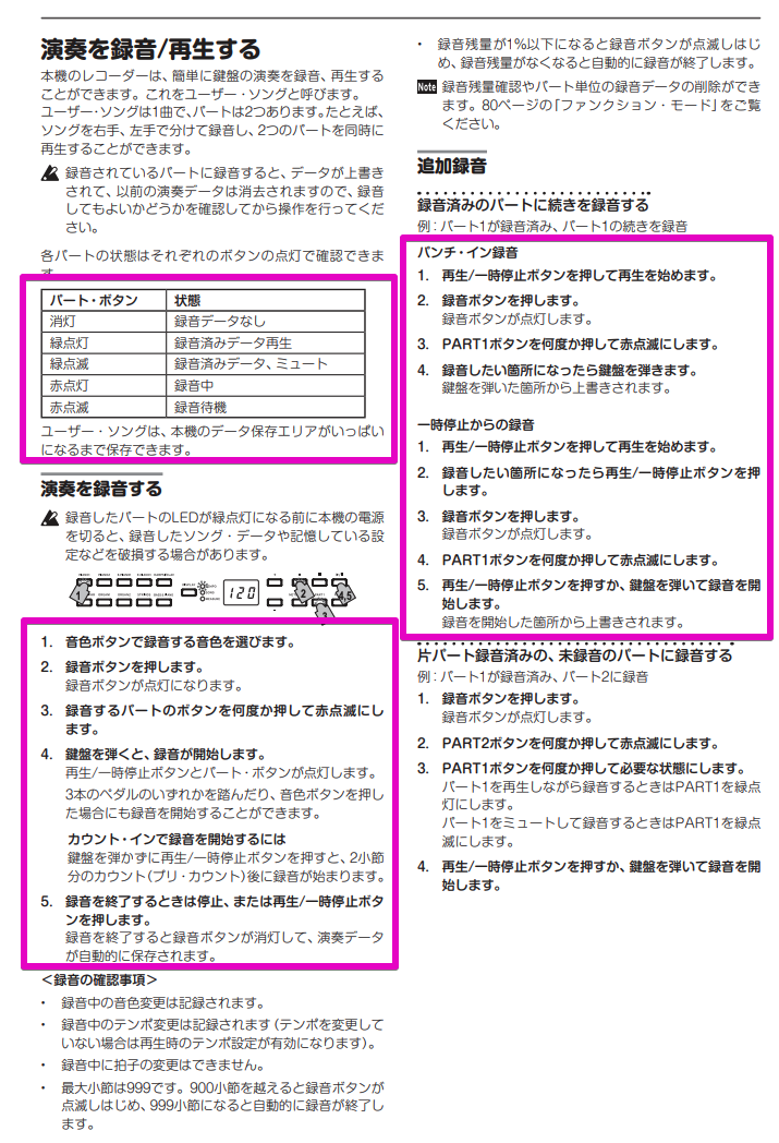 コードが弾けるようになったので、一人で演奏するためには『メロディ』も弾きたい。そこで登場するのが、録音機能だ。